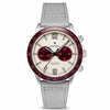 A deep burgundy frame surrounds an off-white dial that mirrors the moon’s surface. Crimson subdials cut through the calm like an eclipse in motion, while the gray Saffiano leather strap grounds the design.