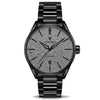 Close-up of a black wristwatch with detailed face and brand logo on a black background