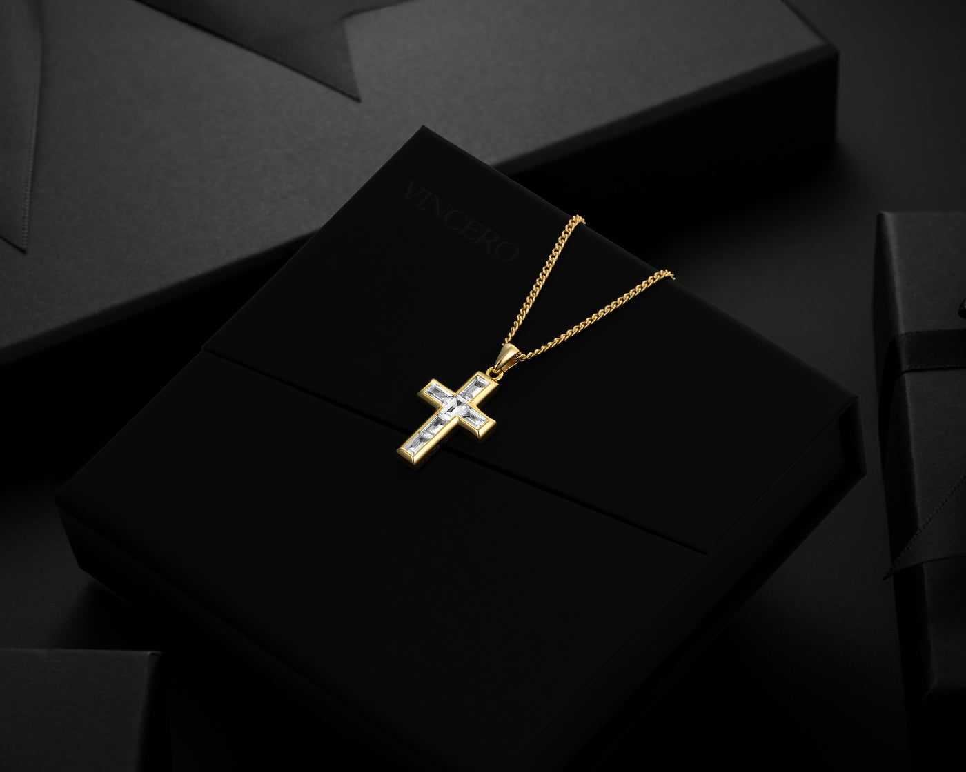 DescriptionLimited Edition Diamond Cross – Strength in Light A timeless evolution of our best-selling stone cross, designed for those who lead with clarity and purpose. This limited release features six baguette-cut AAA cubic zirconia stones forming the heart of the cross, all set in a polished 14K gold-plated 925 sterling silver frame. Bold yet refined, it’s a piece that captures the quiet power of focus and unwavering resolve. Cubic Zirconia Cubic zirconia is celebrated for its brilliance and purity, symbolizing clarity, truth, and endurance. Each AAA-rated stone reflects light with a diamond-like fire.