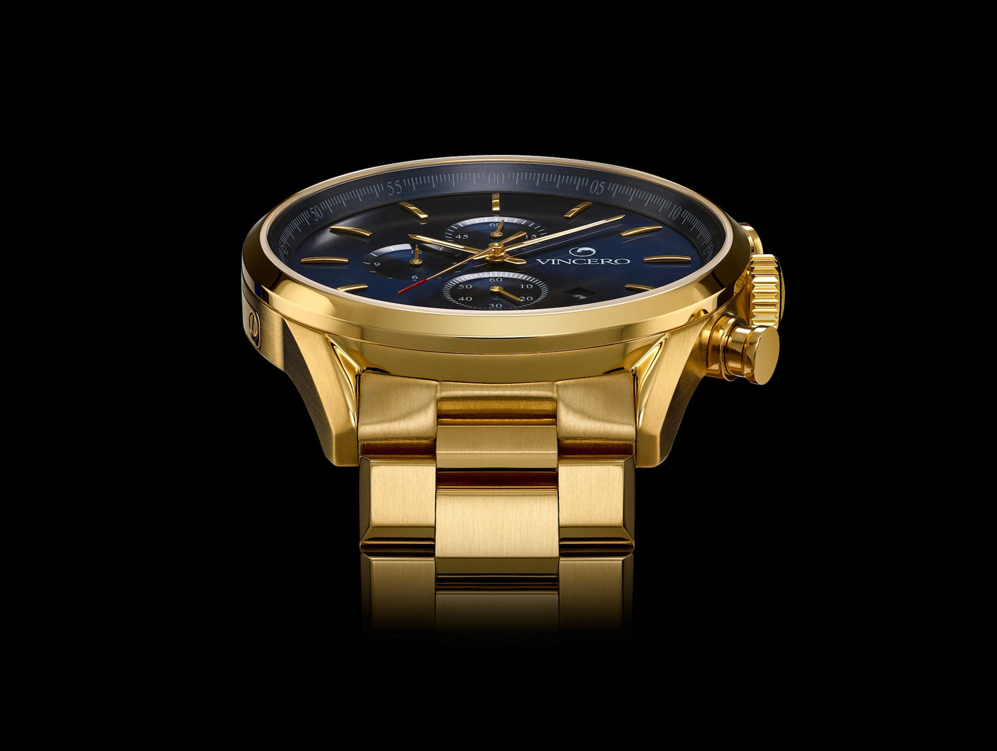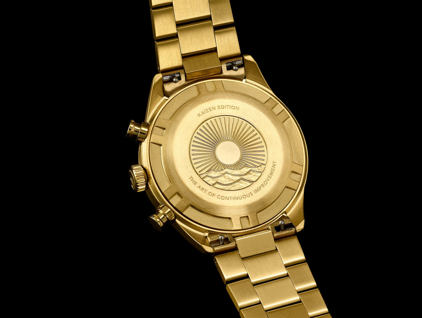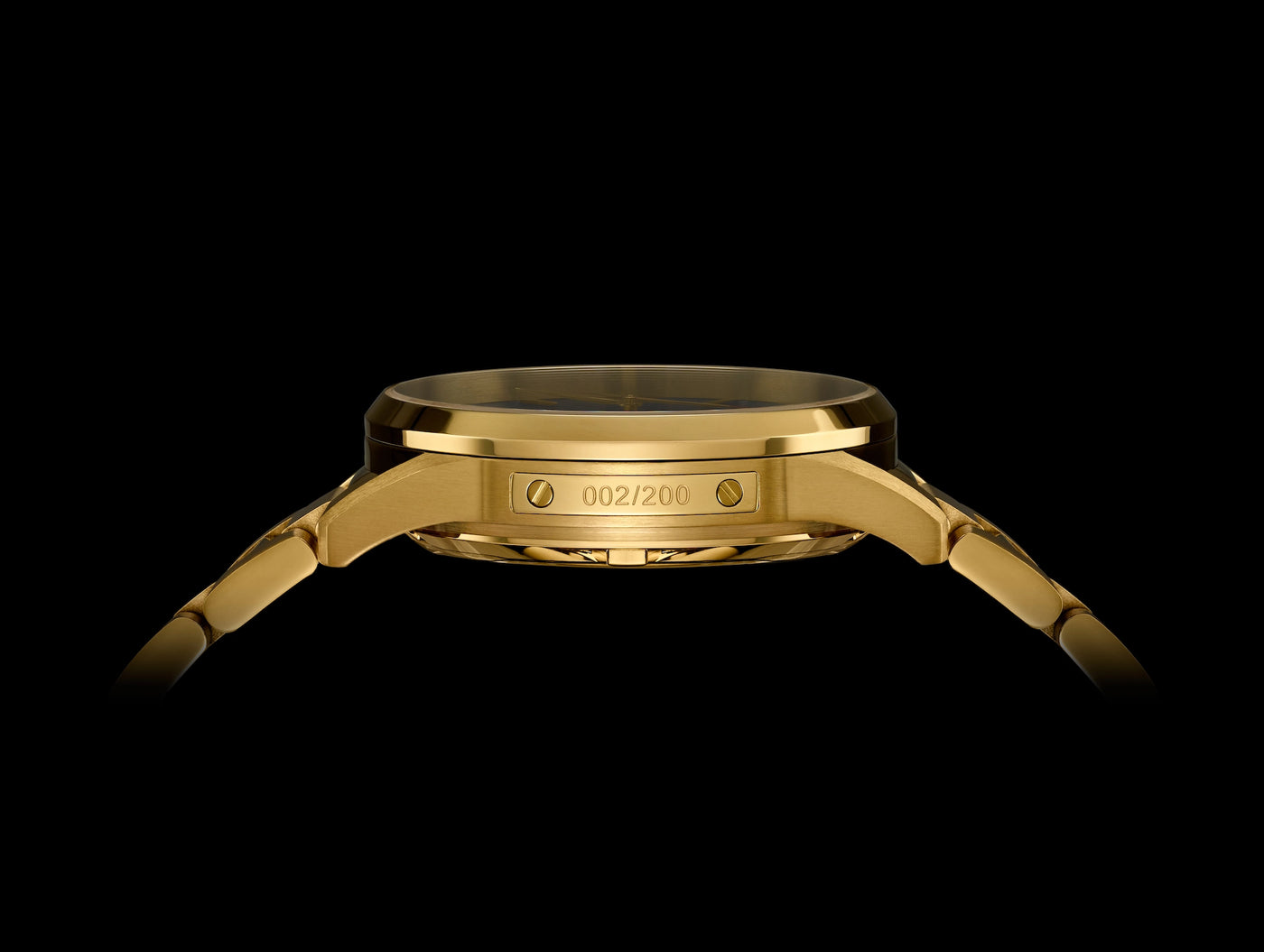 Every timepiece in this collection comes with 2 band options. The first is a blue ecco leather strap that features a gold foil moniker. The second is a custom gold PVD-coated stainless steel bracelet designed specifically for this project.