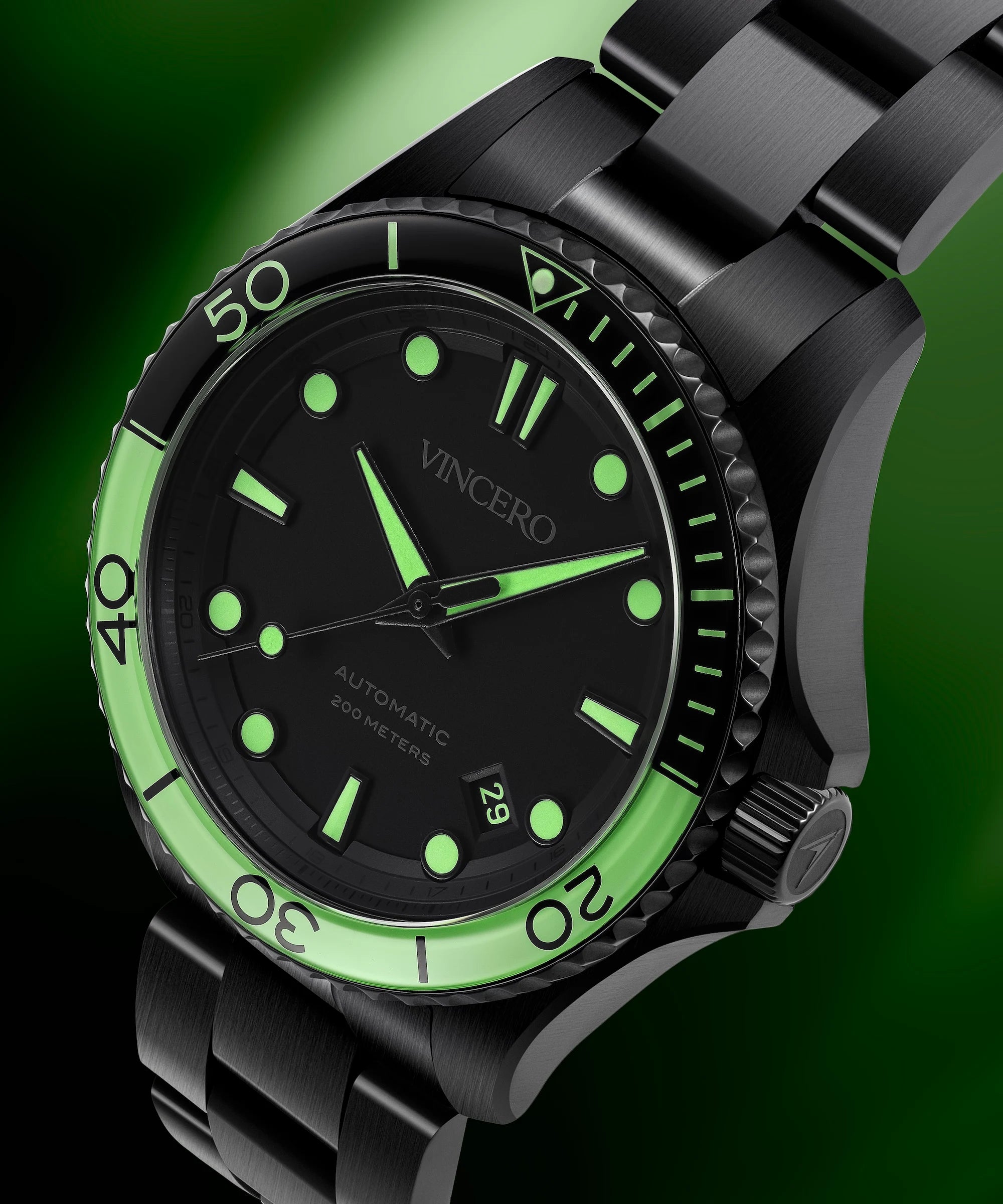 Custom green lume applied to the hands and indices for visibility that doesn't ask for better conditions. In daylight it pops. In the dark it takes over. Function with an edge.
