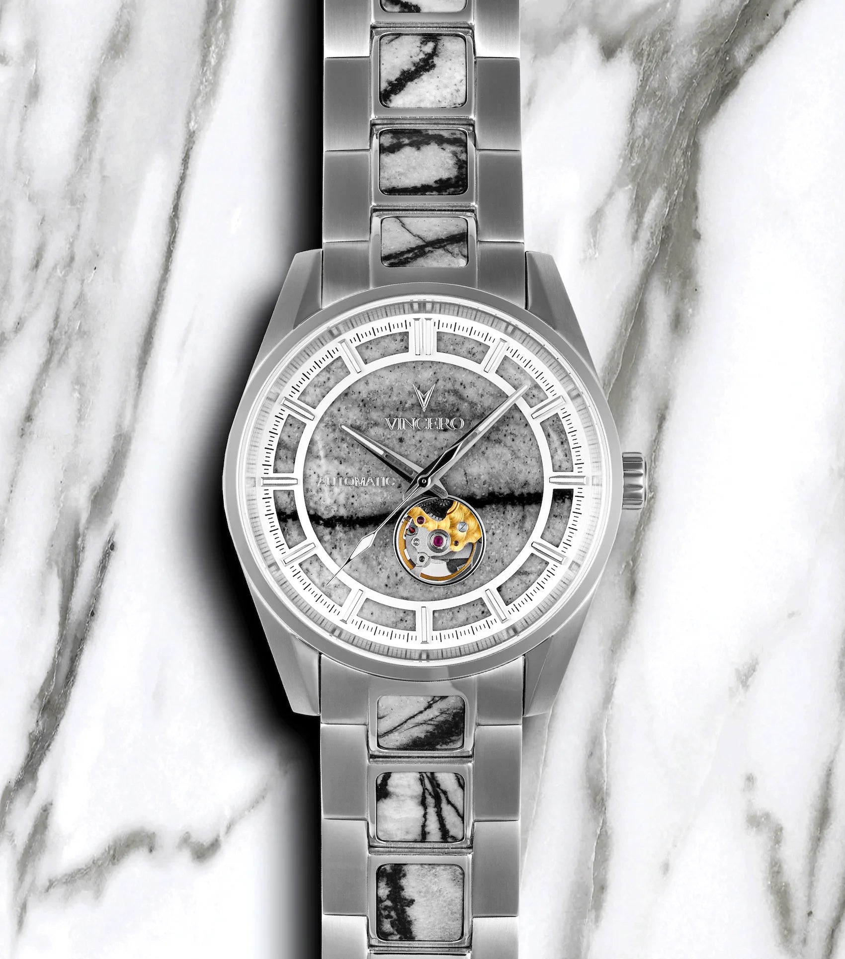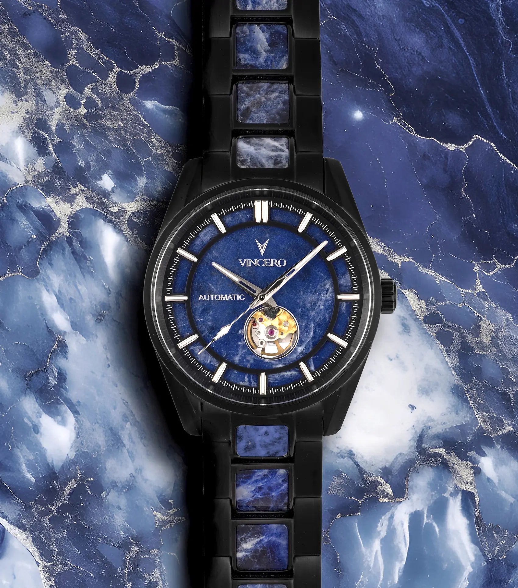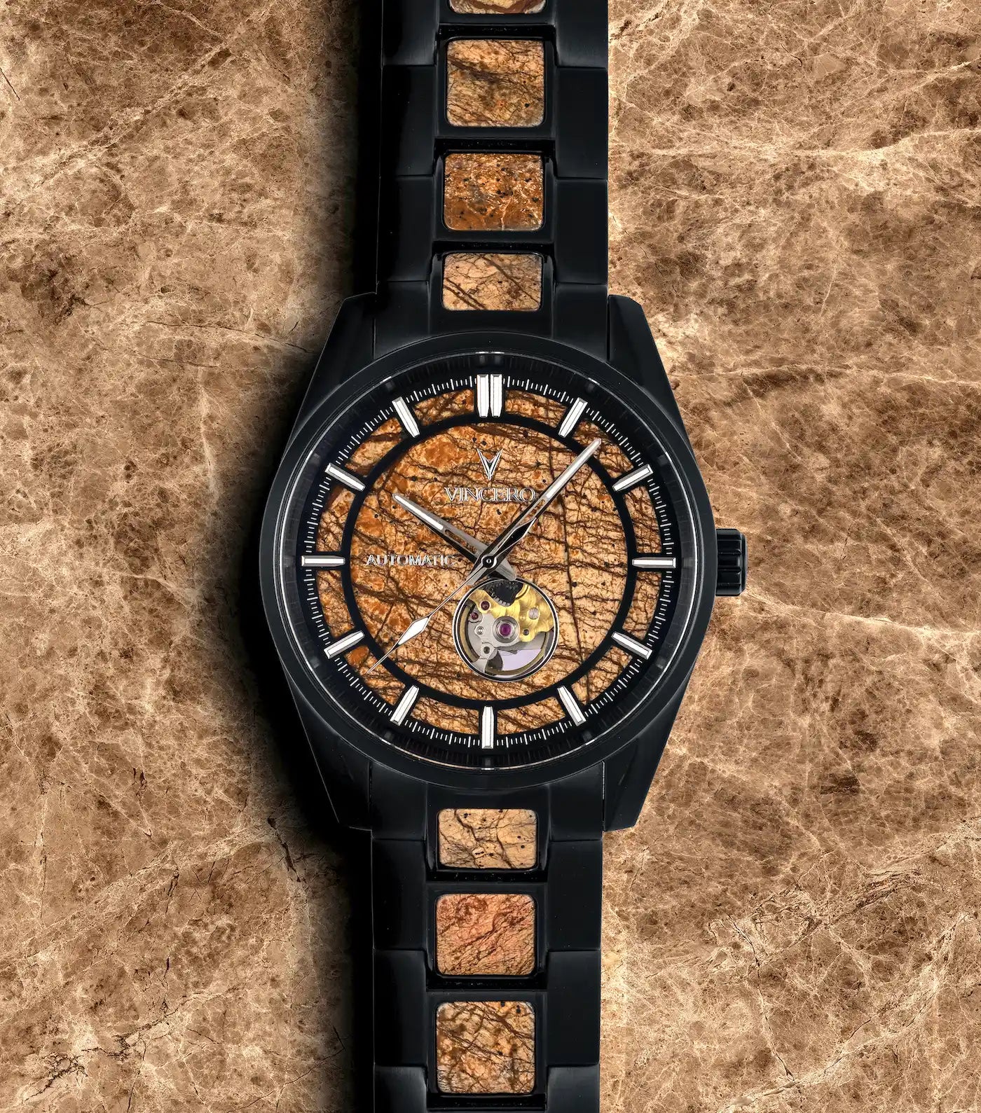 The sandwich dial exposes the natural beauty of each stone across the entire width of the face, creating a striking visual impact.
