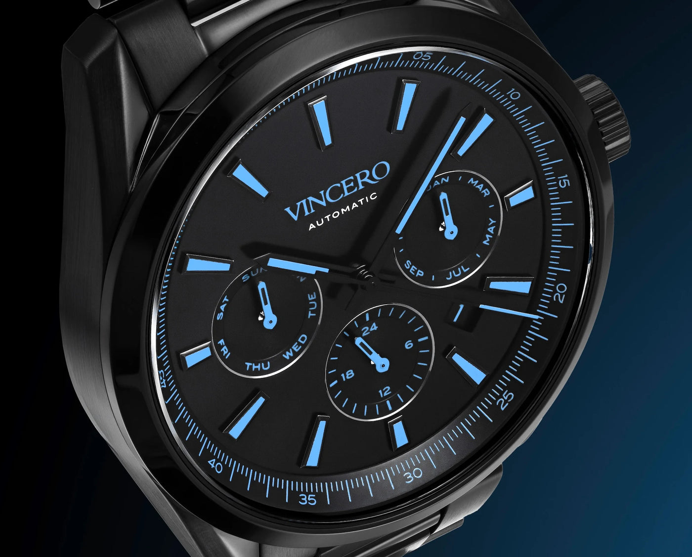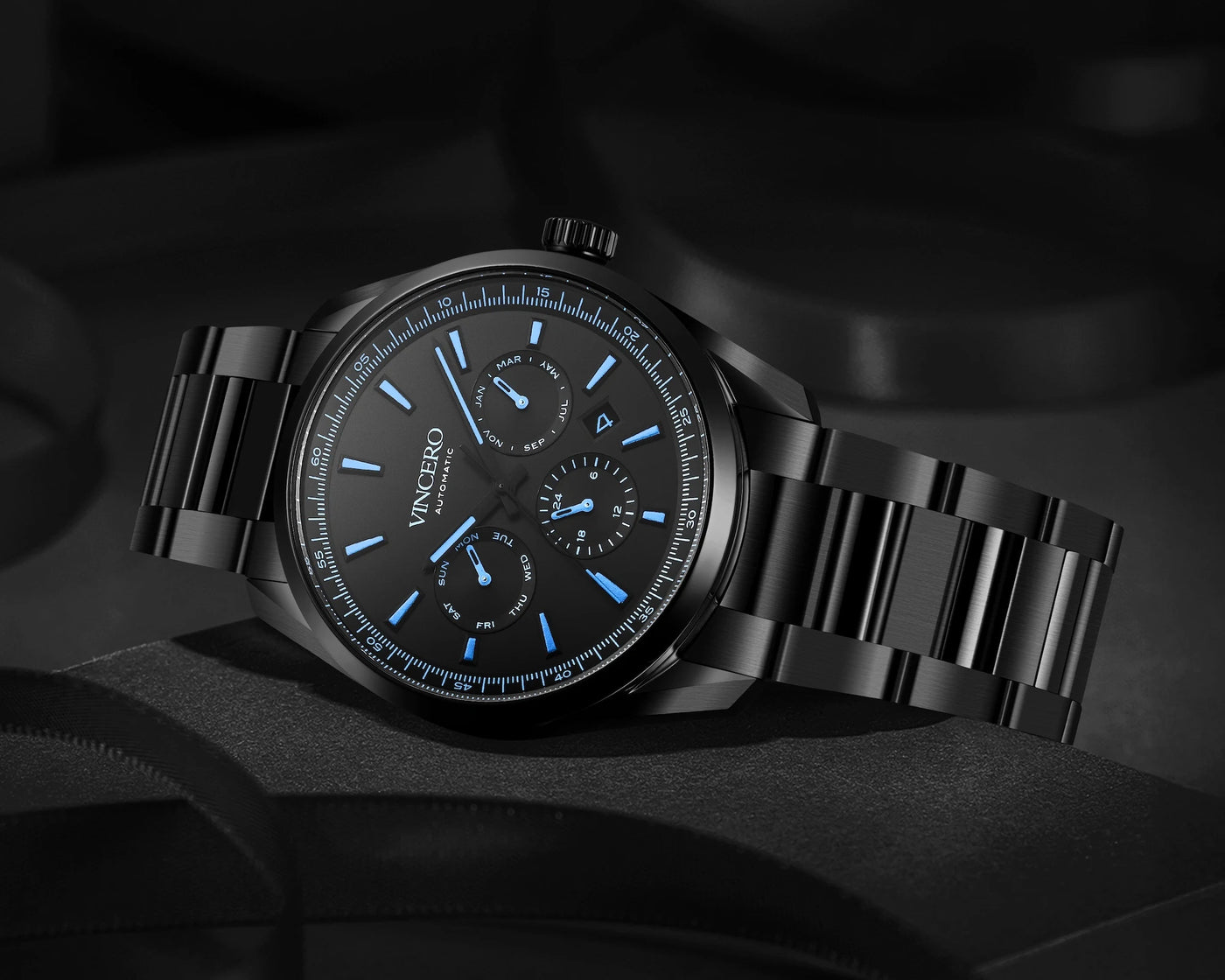 A cold blue glow set against an all-black build. Purpose-driven and unmistakable, the sapphire lume brings clarity and contrast when light fades.